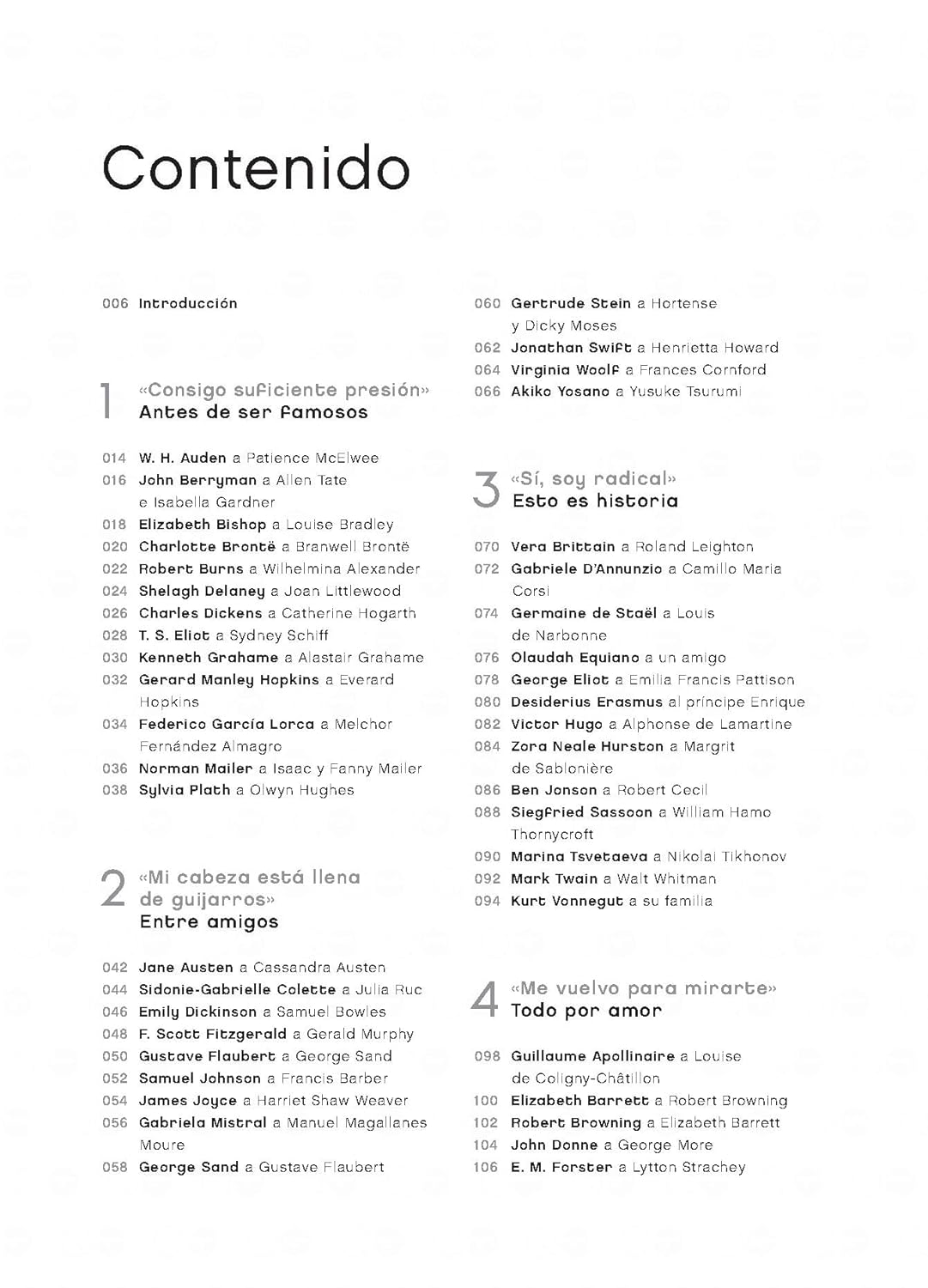 • Ordenada por temas, las cartas escritas por destacados novelistas, poetas, dramaturgos y ensayistas se reproducen aquí junto con su transcripción e interesantes detalles sobre el contexto en que se escribieron.