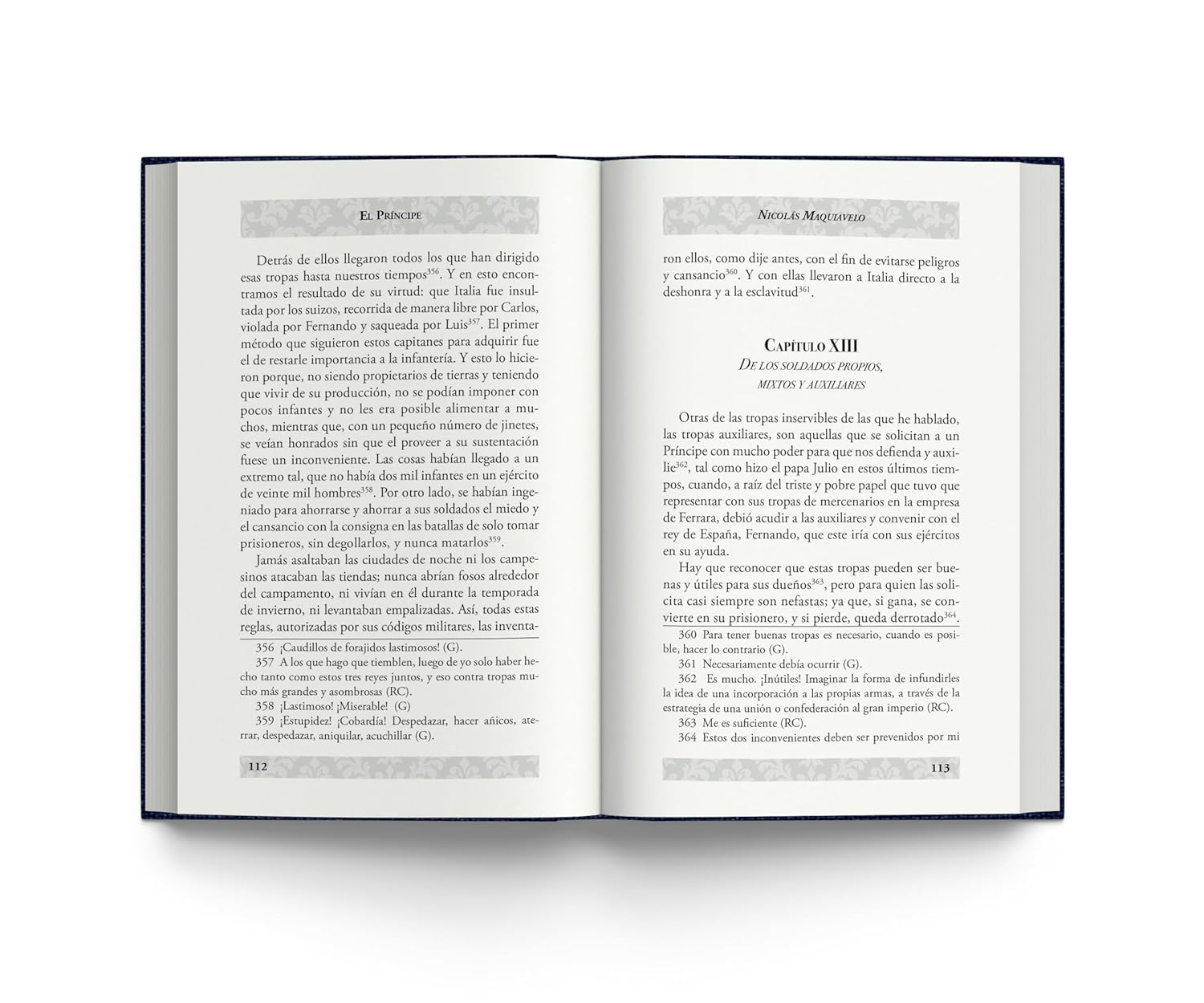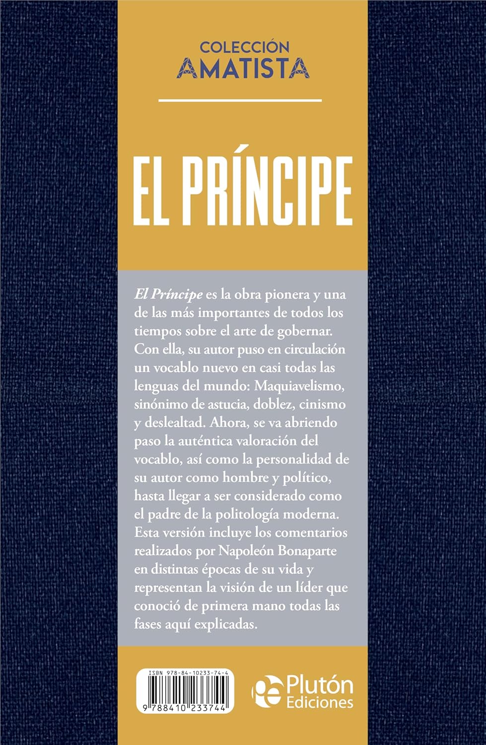 "El Príncipe" es la obra pionera y una de las más importantes de todos los tiempos sobre el arte de gobernar. Con ella, su autor puso en circulación un vocablo nuevo en casi todas las lenguas del mundo: Maquiavelismo, sinónimo de astucia, doblez, cinismo y deslealtad. Ahora, se va abriendo paso la auténtica valoración del vocablo, así como la personalidad de su autor como hombre y político, hasta llegar a ser considerado como el padre de la politología moderna. Esta versión incluye los comentarios realizados por Napoleón Bonaparte en distintas épocas de su vida y representan la visión de un líder que conoció de primera mano todas las fases aquí explicadas.